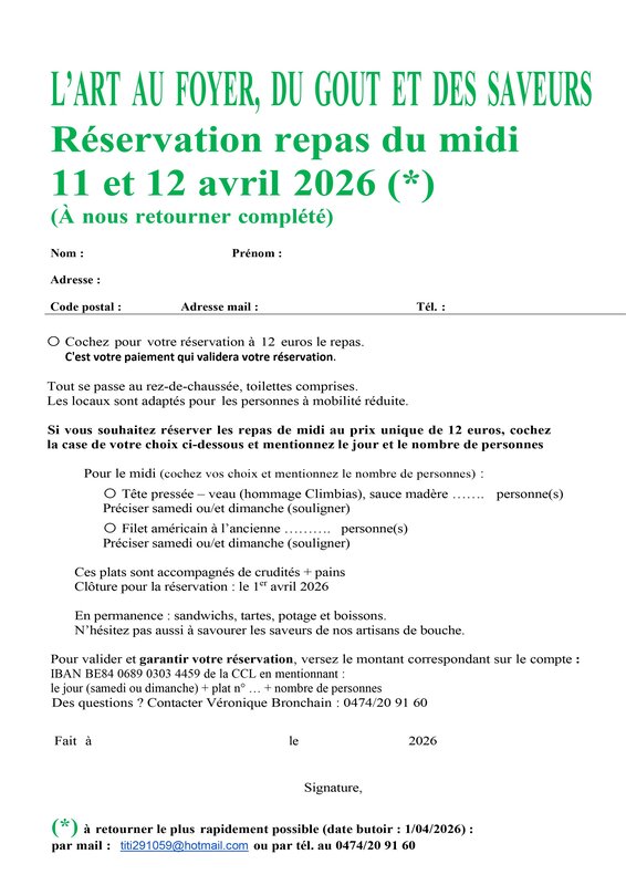 Pour sa 19° édition de l'Art au Foyer..., la Ccl soufflera ses 50 bougies sur le thème du Carnaval. La commission rendra hommage aux Climbias qui ont fêté leur 100ème participation au carnaval de Charleroi. On évoquera aussi le carnaval de Venise. N'hésitez pas à visiter nos artisans du goût et des saveurs qui raviront vos papilles. Vous pourrez aussi profiter de notre petite restauration, nos sandwichs, nos pâtisseries,... Vous êtes aussi cordialement invités à l'inauguration du samedi 11 avril à 18h30. Accès à la mobilité réduite par la rue Balizeau.