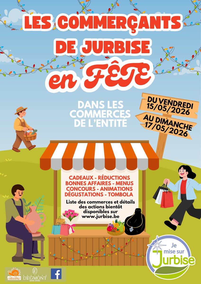 Du vendredi 15 au dimanche 17 mai 2026, dans les commerces de l’entité, ne manquez pas le week-end des Commerçants de Jurbise en Fête ! Les commerçants, restaurateurs, indépendants et artisans de Jurbise vous ouvrent leurs portes !