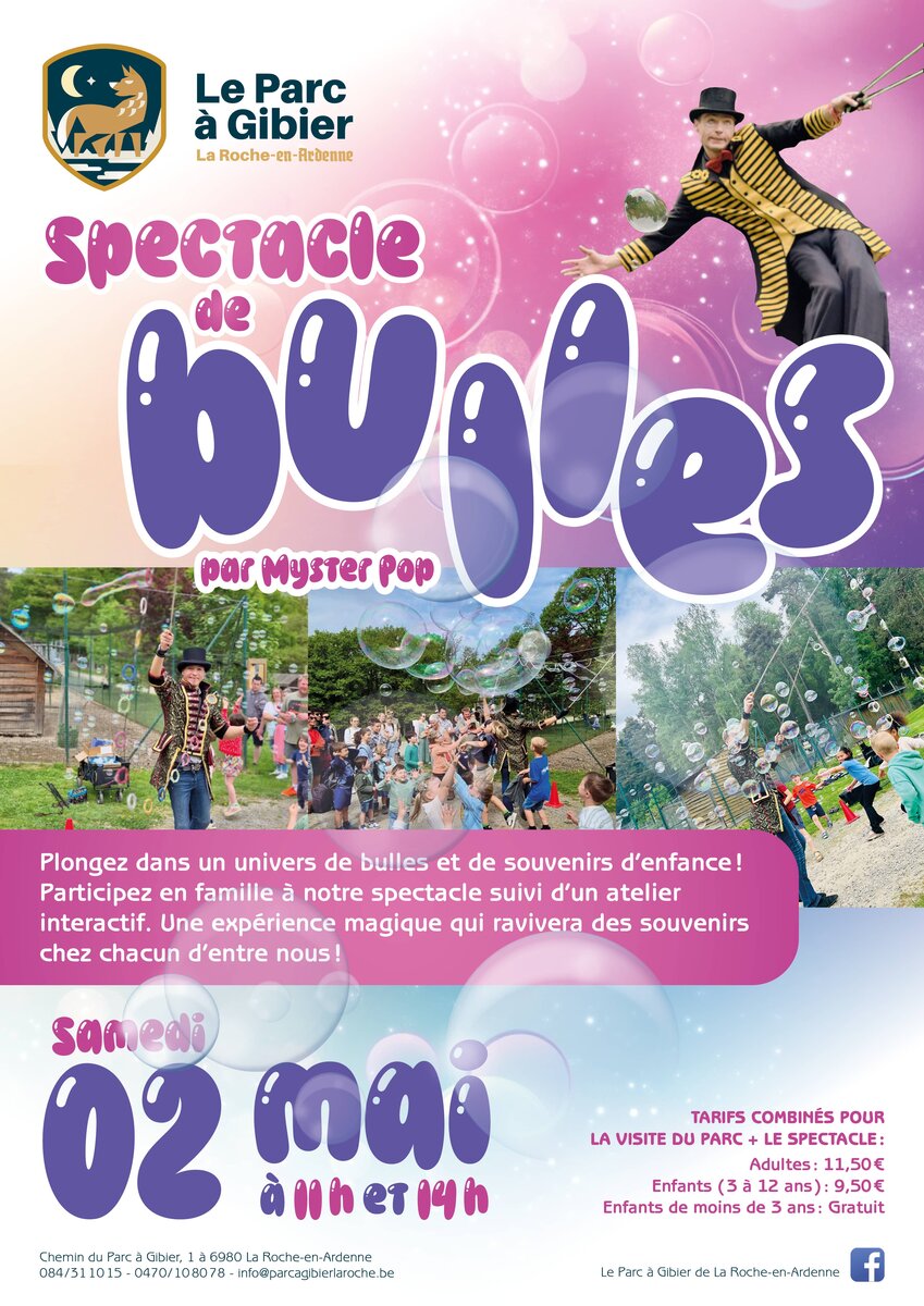 Une chouette activité à prévoir le samedi 02 mai au Parc à Gibier ! En plus de votre visite, découvrez un magnifique spectacle de bulles à 11h et à 14h.