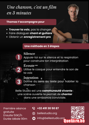 Viens chanter à Belle Studio. Je t'aide à libérer ta voix et ton interprétation, je t'accompagne à la guitare et je t'enregistre dans un studio professionnel à quelques kilomètres de Louvain-la-Neuve à Mont-Saint Guibert. Première séance gratuite. Découvre les enregistrements des autres membres de la communauté Belle Studio : https://bellestudio.org