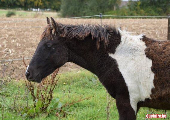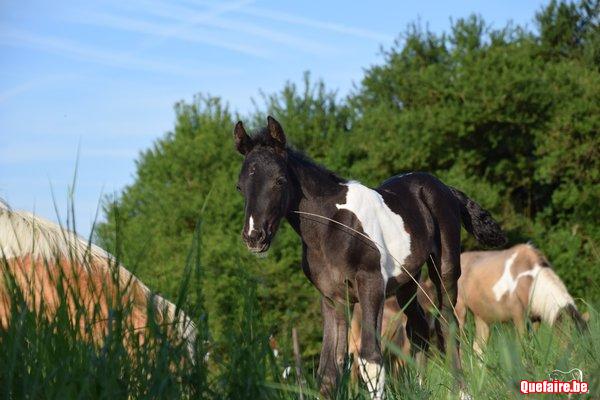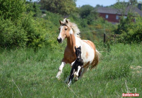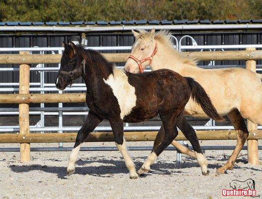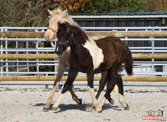 Sa maman est Dream (née également chez nous), irish cob, de robe pie palomino. Dream participe à nos randonnées et à nos cours.