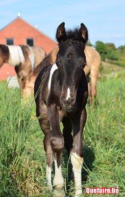 Elle a également une très jolie robe pie (nous la pensons smocky black mais à voir son évolution), elle a un joli marquage avec peu de blanc et des grandes balzanes blanches. Elle a un regard expressif et une très jolie bouille à bisous.