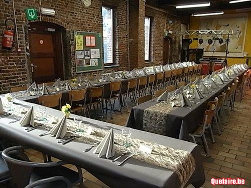 Tables, chaises, vaisselle, couverts et verres à vin et à eau sont disponibles pour 60 personnes et compris dans le prix.