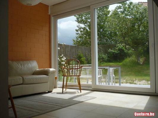 Living et salle de jeux séparée avec porte vitrée vers le jardin, cuisine équipée frigo, lave vaisselle, four et micro-ondes