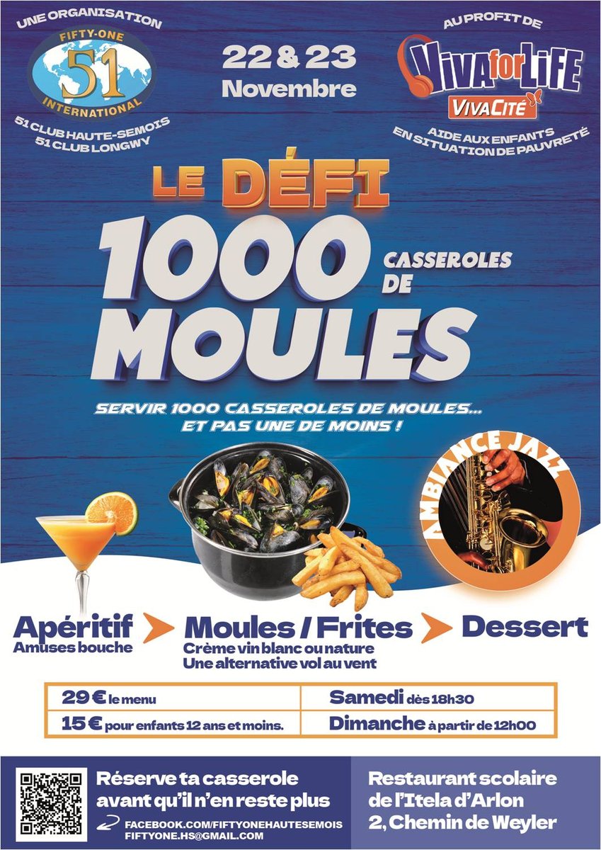 Participez à une expérience gourmande et solidaire d’exception avec le Défi des 1000 casseroles de moules, organisé par les clubs Fifty One Haute-Semois et Longwy. Les 22 et 23 novembre.