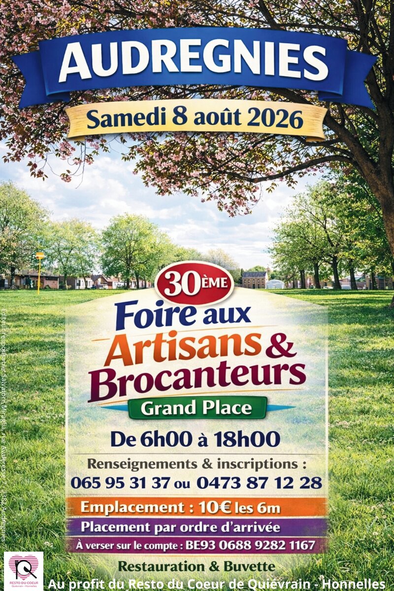 Nous vous accueillons sur la plus grande place arborée de Belgique pour notre 30e Foire aux Artisans et Brocanteurs, au profit du Resto du Coeur de Quiévrain - Honnelles.