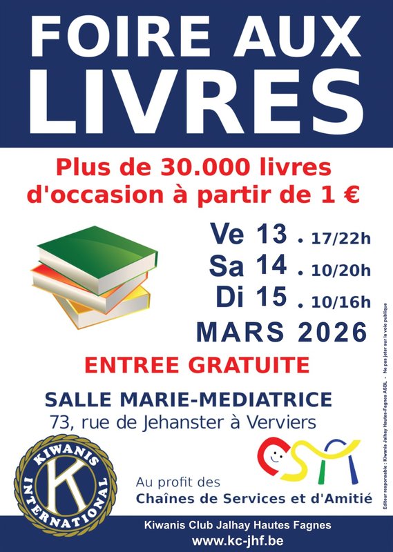 Vous cherchez de la lecture pour vos prochaines vacances ? La foire aux livres du Kiwanis Club Jalhay Hautes Fagnes est faite pour vous ! Plus de 30 000 livres d’occasion seront mis en vente au profit de l’Enfance défavorisée, et plus spécifiquement des Chaines de Service et d’Amitié de Verviers (https://www.csav.be).