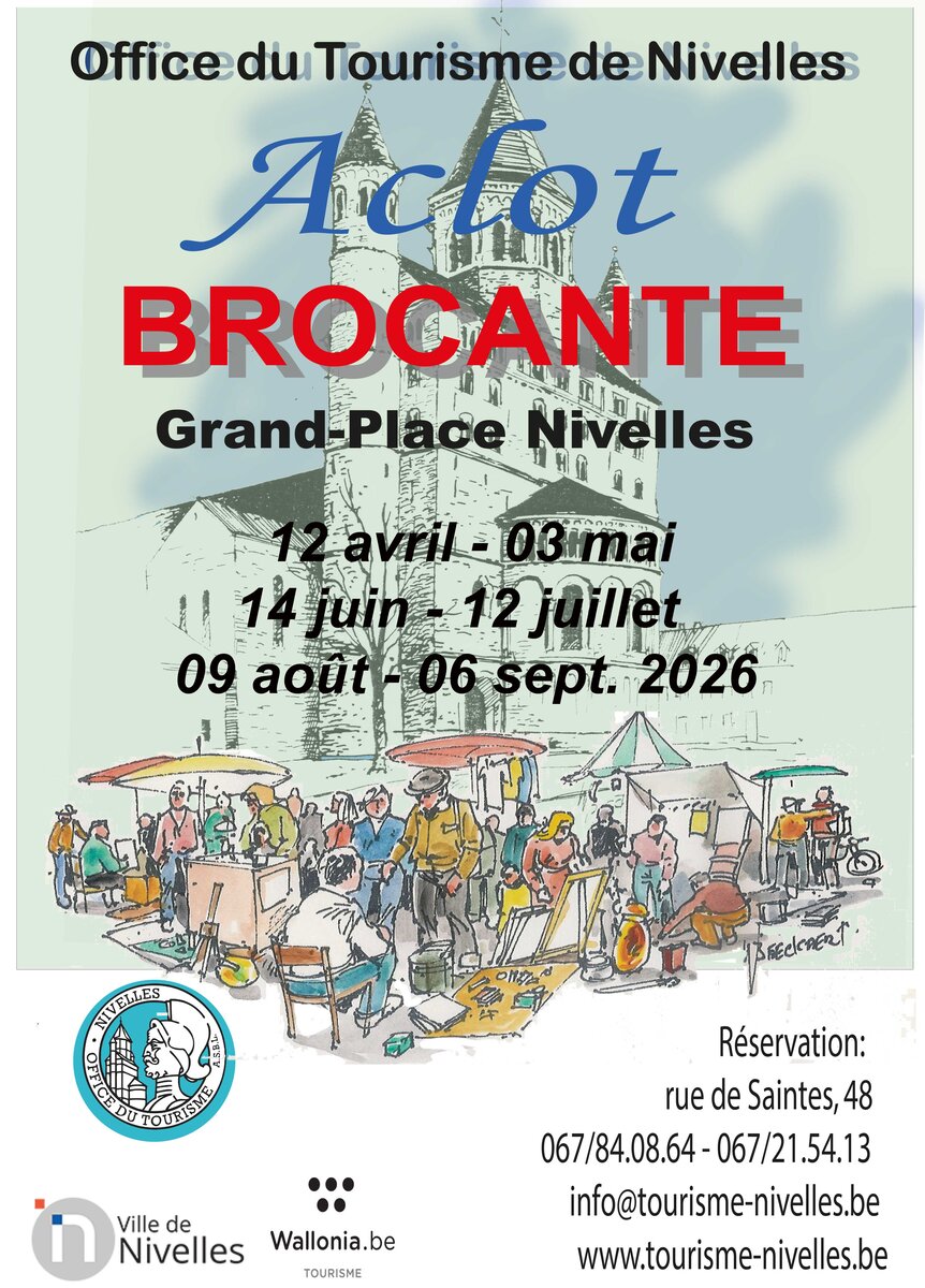 Vu le succès des années précédentes, l'Office du Tourisme de Nivelles relance pour la 27ème année la saison des "Aclot brocante", autour de la Collégiale de Nivelles.