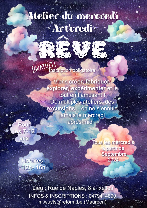 Nos ateliers arts plastiques tourneront autour du rêve sous toutes ses formes : installations, récup, grands formats, sculpture, dessins, peinture, son, vidéo, plantation,.. . Viens rêver le monde de l'art plastique en long et en large !