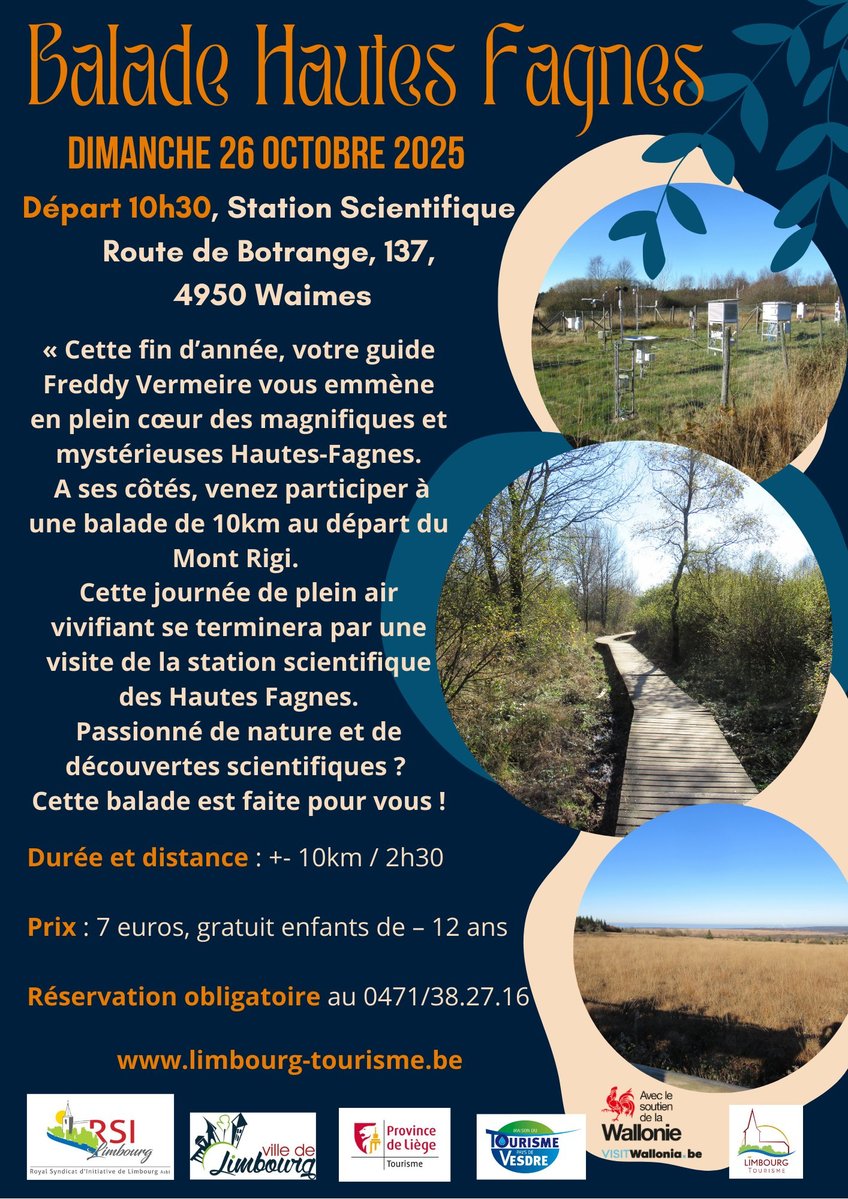 Cette année, votre guide Freddy Vermeire, membre du Royal Syndicat d'Initiative de Limbourg, vous emmène en plein cœur des magnifiques et mystérieuses Hautes Fagnes. A ses côtés, venez participer à une balade de 10km au départ du Mont Rigi. Cette journée de plein air vivifiant se terminera par une visite de la station scientifique des Hautes Fagnes.