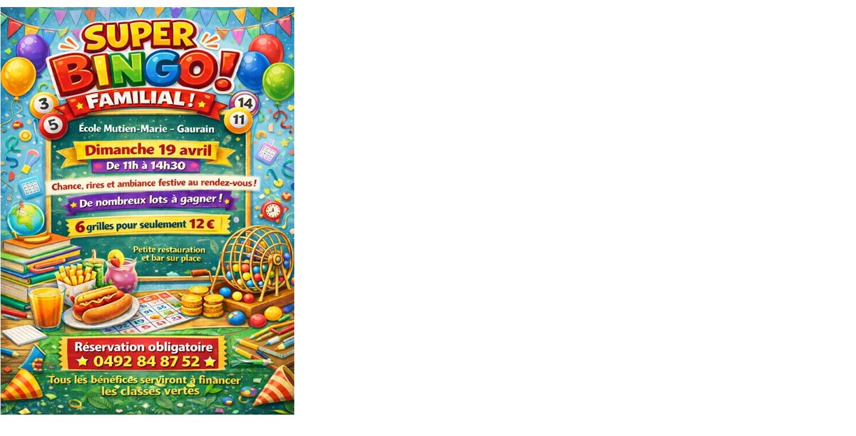 L’école organise un bingo convivial ouvert à tous. Venez passer un moment agréable dans une ambiance chaleureuse et festive, tout en tentant de gagner de nombreux lots. Un bar et une petite restauration seront également proposés sur place. Les bénéfices récoltés serviront à financer les classes vertes des élèves.