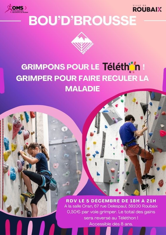 Préparez-vous pour une soirée sportive et solidaire avec Bou'D'Brousse – Téléthon ! Le vendredi 5 décembre, de 18h à 21h, rendez-vous à la salle Oran Delespaul pour une session d'escalade spéciale où chaque ascension compte pour la recherche.