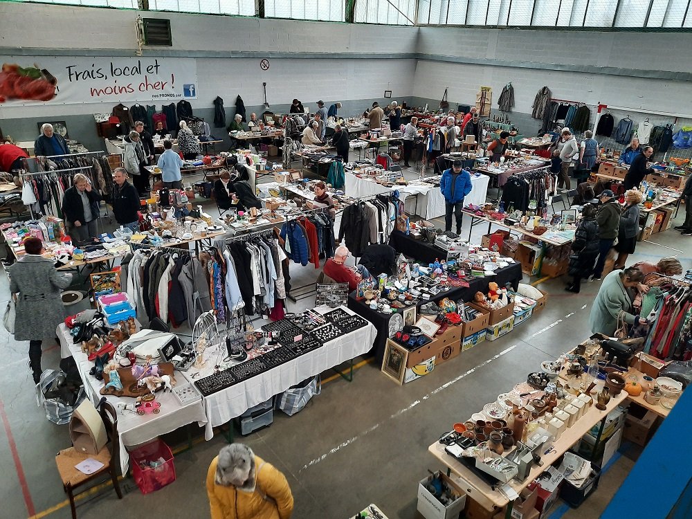 brocante intérieur, 46 exposants, emplacement de 4m, deux tables de 2m plus deux chaises.