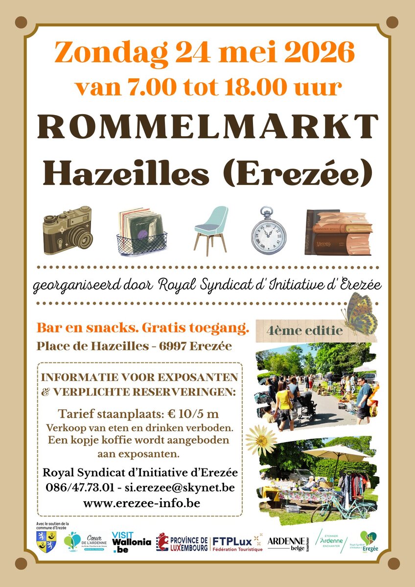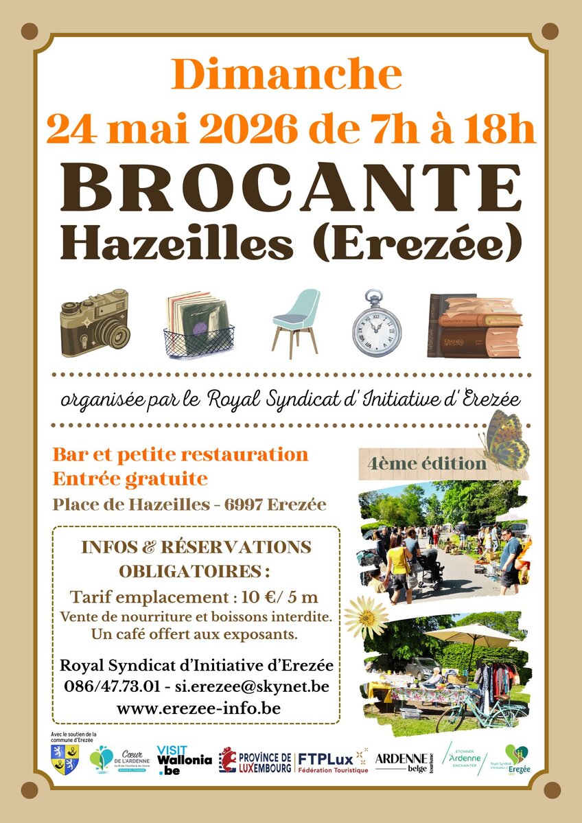 brocante de Hazeilles (Erezée/Province de Luxembourg) – 4ème édition. Dimanche 24 mai 2026 de 7h à 18h.