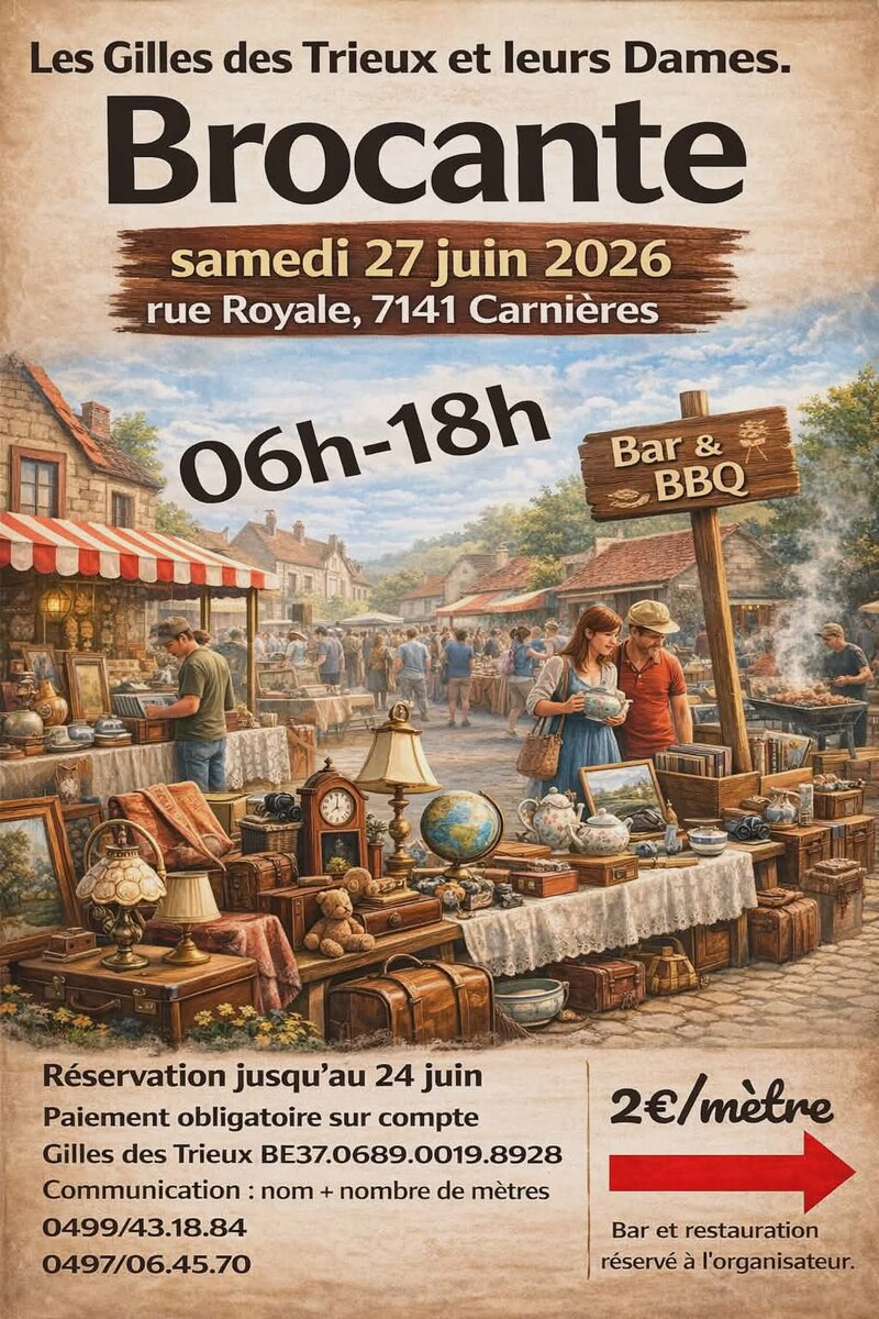Bonjour la société des Gilles et des dames des trieux à carnieres organise le samedi 27juin 2026 à partir de 06 h brocante à la rue royale à 7141 carnieres..Les artisans sons les bienvenus. Marchant de bonbons. Marchant se saucissons ect sons aussi les bienvenus juste téléphone pour réservé l emplacement. le prix est de 2 euros le mètre si vous désirez faire partie de la brocante il vous suffit de téléphone au numéro indiqué sur l affiche après réception du payement sur le compte votre inscription sera validé n oublié pas de metre en communications non prénom et les mètre que vous prenez. Seul les boissons et restauration sons réservés à la société donc interdit de vendre des boissons ou nourriture merci