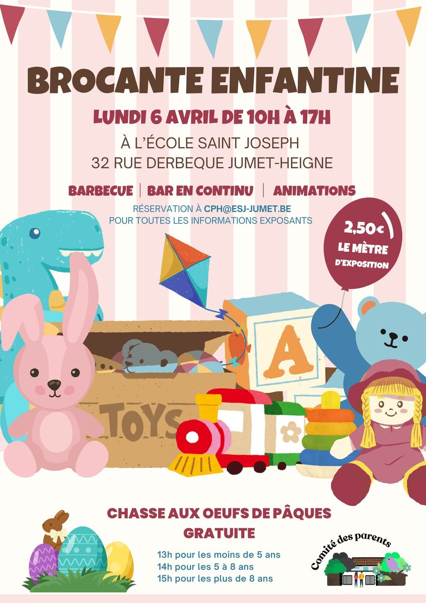 Le comité de parents des écoles "Les Petites plumes" et St-Joseph Jumet-Heigne organisent une brocante enfantine le lundi de Pâques. Vêtements de seconde main, jouets ou articles de puériculture, venez découvrir ce que nos exposants ont à vous proposer.