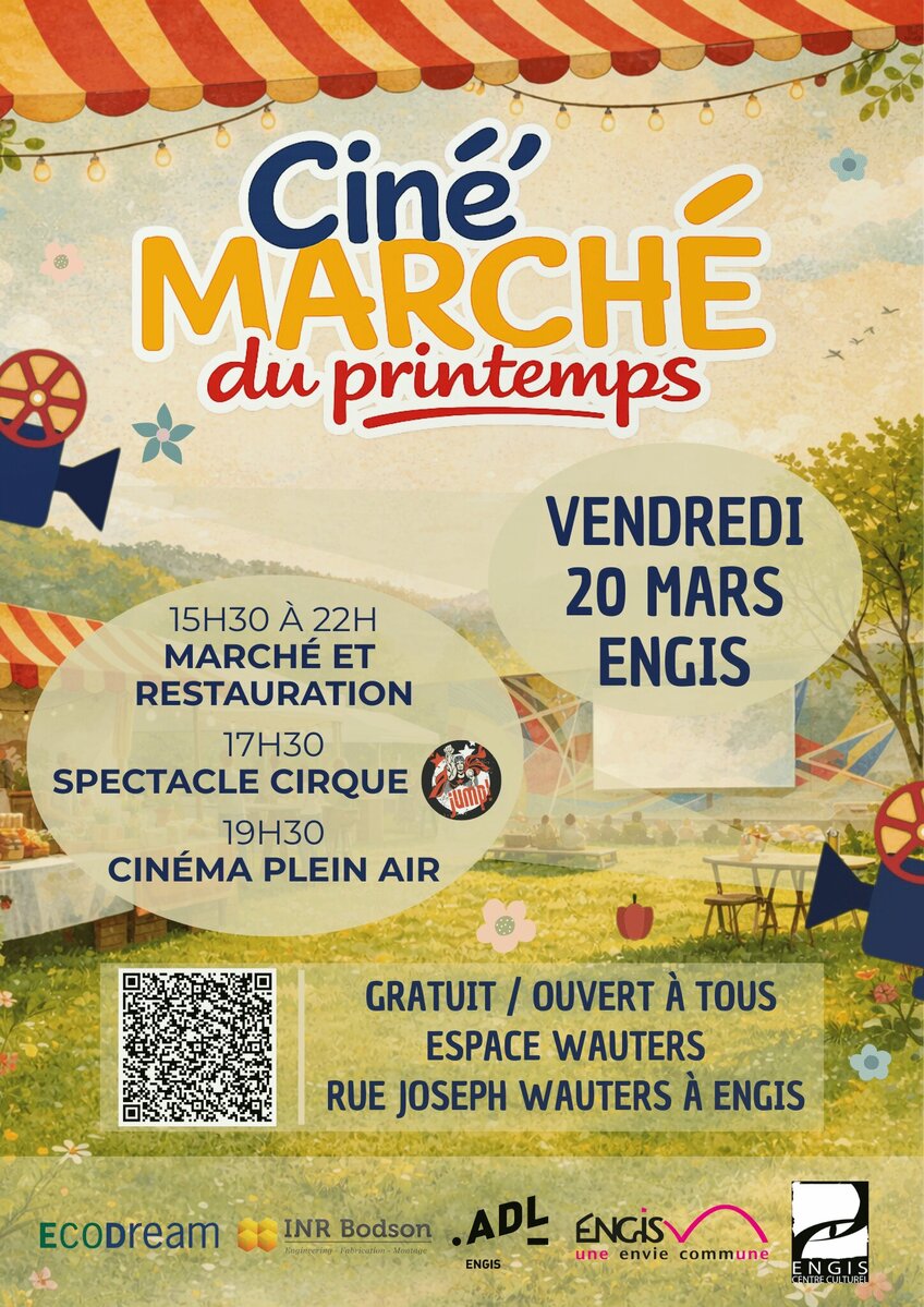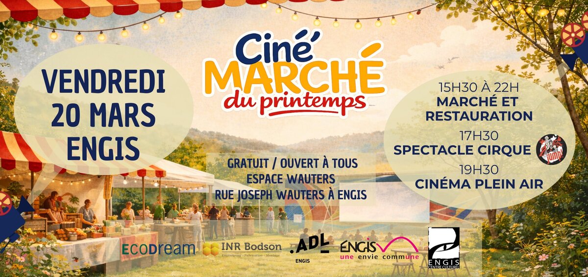 Le Ciné’Marché du printemps revient à Engis le vendredi 20 mars 2026 de 15h30 à 22h à l’Espace Wauters pour une soirée conviviale pour petits et grands mêlant marché local, spectacle familial et cinéma en plein air.