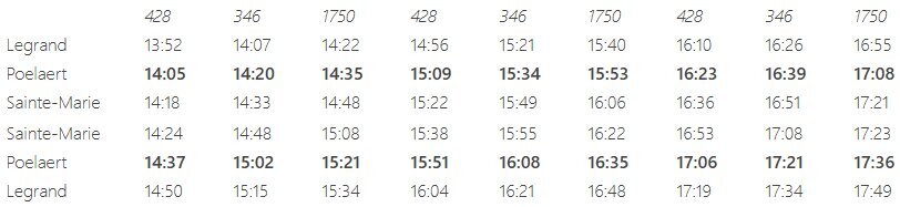Trois trams centenaires de notre collection (les motrices 428, 346 et 1750) circuleront entre 14h et 17h30 selon l’itinéraire Legrand-Poelaert-Sainte-Marie.