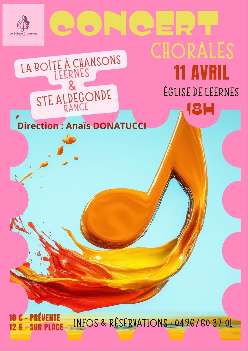 Les chorales : Royale Sainte Aldegonde de Rance et La Boîte à Chansons de Leernes vous invitent à partage leur concert de printemps à Leernes. Une soirée à laquelle vous pourrez participer activement puisque les choeurs se sont appliqués à choisir le meilleur du répertoire populaire français. .. une bonne ambiance, simple et chaleureuse, accès aux Pmr, bar-tombola et tartes à la maison de la Laïcité située juste à côté de l'église.