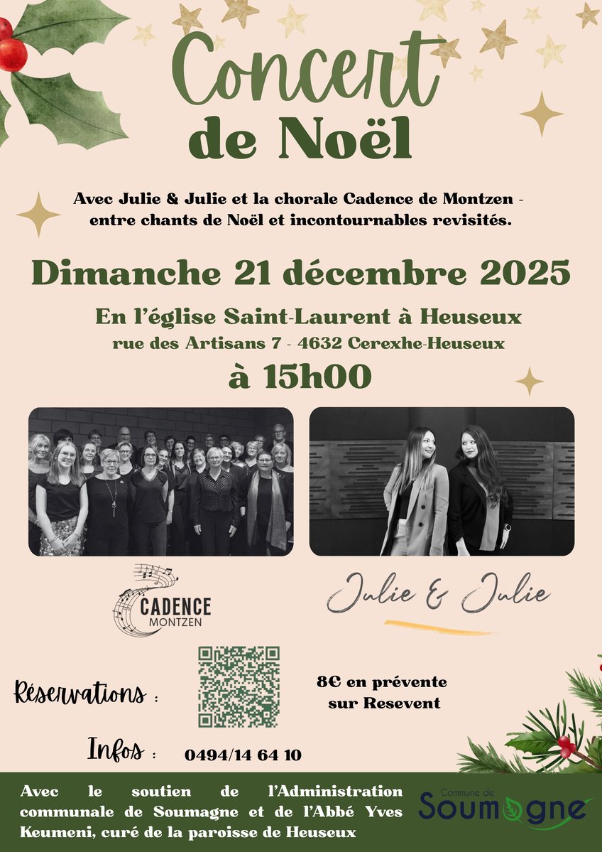 Nous aurons le plaisir de vous retrouver le dimanche 21 décembre à 15h, en l’église Saint-Laurent de Heuseux, pour un moment chaleureux entre chants de Noël et incontournables revisités.