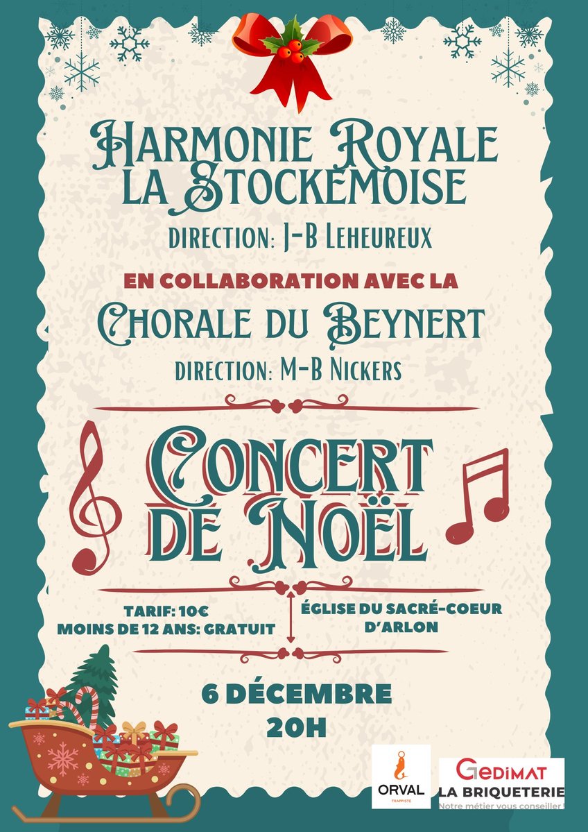 L'harmonie La Stockemoise, sous la baguette de Jean-Bernard Leheureux propose, en collaboration avec la chorale du Beynert, dirigée par Marie-Béatrice Nickers un concert de Noël à l'Eglise du Sacré-Coeur à Arlon le samedi 6 décembre à 20h.Des morceaux en commun alterneront avec des oeuvres propres à chaque ensemble.
