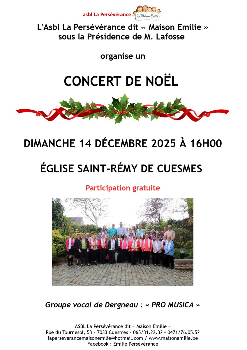 Nous organisons un concert de Noël le dimanche 14 décembre à l'Église St-Rémy de Cuesmes à 16h00.