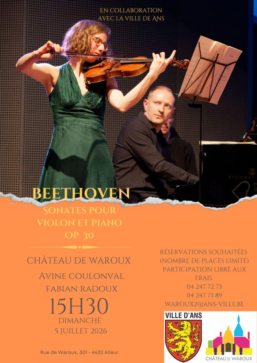 Le dimanche 5 juillet à 15h30, Avine Coulonval (violon) et Fabian Radoux (piano) joueront les trois sonates op. 30 (c'est-à-dire les sixième, septième et huitième sonates) de Ludwig van Beethoven pour piano et violon au château de Waroux.