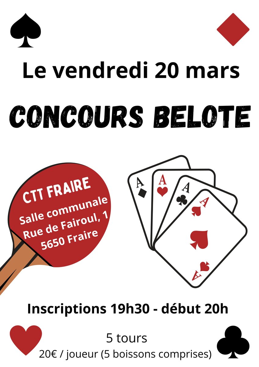 Le Ctt Fraire organise son concours belote avec annonces le vendredi 20 mars.
