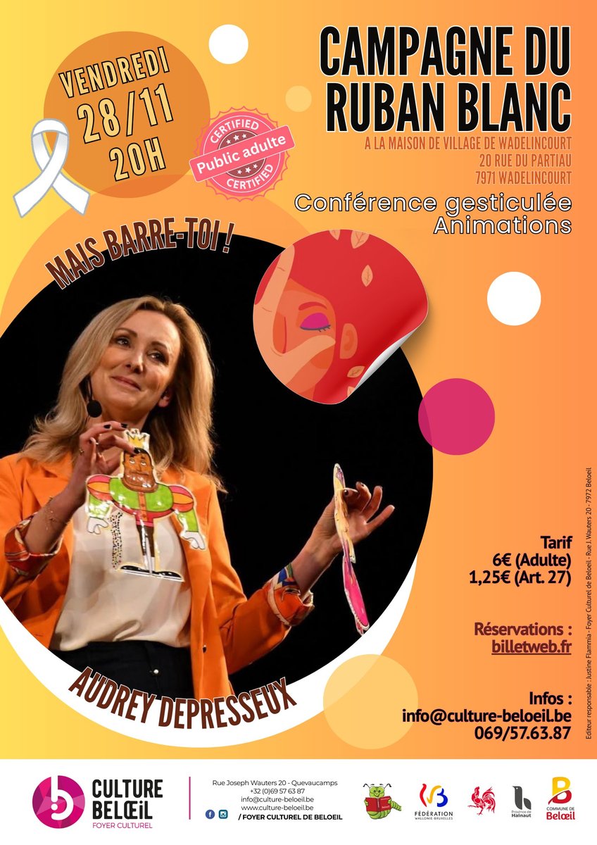 Le Foyer Culturel de Beloeil vous invite à un rendez-vous fort et nécessaire à la Maison de Village de Wadelincourt, dans le cadre de la Campagne du Ruban blanc, qui sensibilise à la lutte contre les violences de genre.