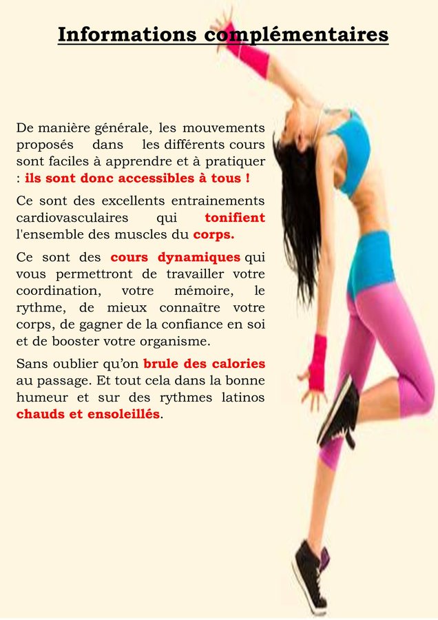 De manière générale, les mouvements proposés dans les différents cours sont faciles à apprendre et à pratiquer : ils sont donc accessibles à tous. Ce sont des excellents entrainements cardiovasculaires qui tonifient l'ensemble des muscles du corps.