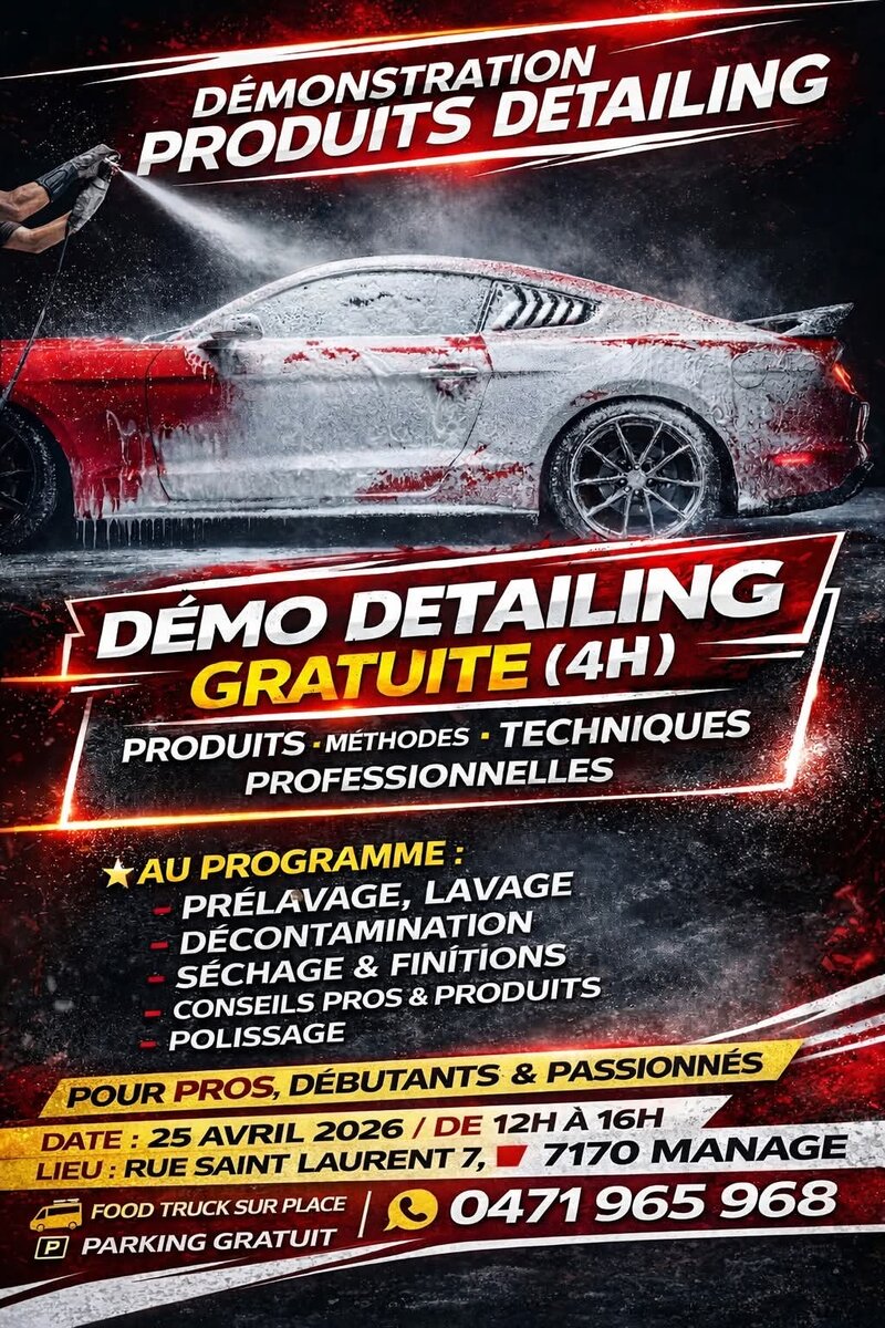 Nous vous invitons à une démonstration gratuite de 4 heures dédiée au detailing automobile, accessible aux professionnels, débutants et passionnés.