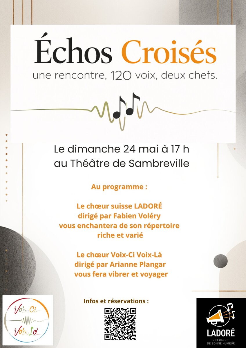 Réunis pour la circonstance, le chœur suisse LadorÉ, dirigé par Fabien Voléry, vous enchantera de son répertoire riche et varié et le chœur Voix-Ci Voix-Là, dirigé par Arianne Plangar, vous fera vibrer et voyager...