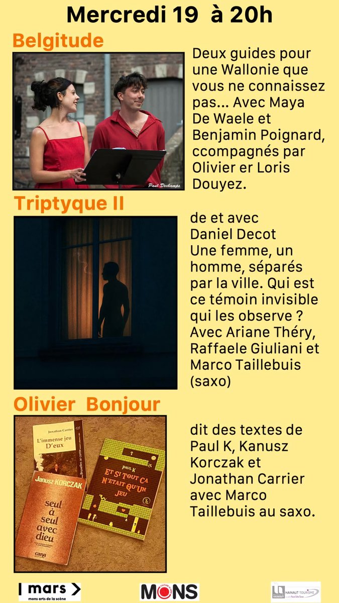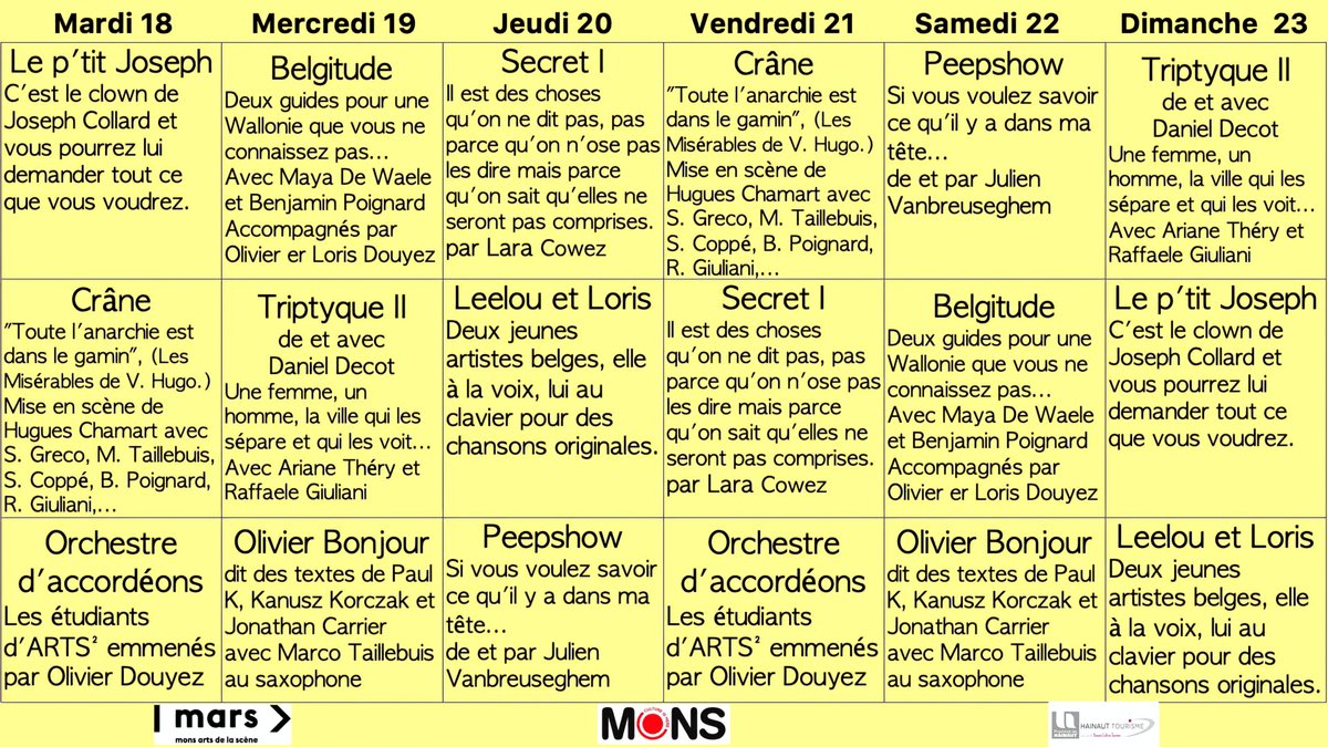 Le Festival Courtes formes, c’est 3 formes de 30 minutes environ par jour, une pause conviviale au bar entre chacune et des découvertes artistiques à chaque fois. Du théâtre, de la musique, des performances pluridisciplinaires, des lectures originales,… pendant 6 jours, à l’Echo des murs, 21, rue Notre Dame 7000 Mons. L’entrée est gratuite, la participation au chapeau à votre discrétion. On vous attend !