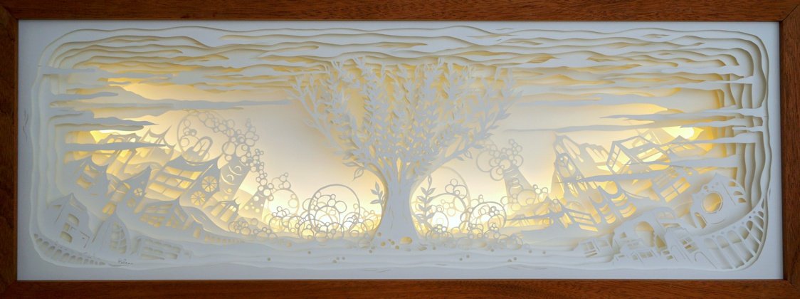 Ses œuvres, réalisées par découpages et superpositions minutieuses de feuilles de papier, prennent forme dans des boîtes lumineuses qui révèlent un univers visuel d’une grande précision.