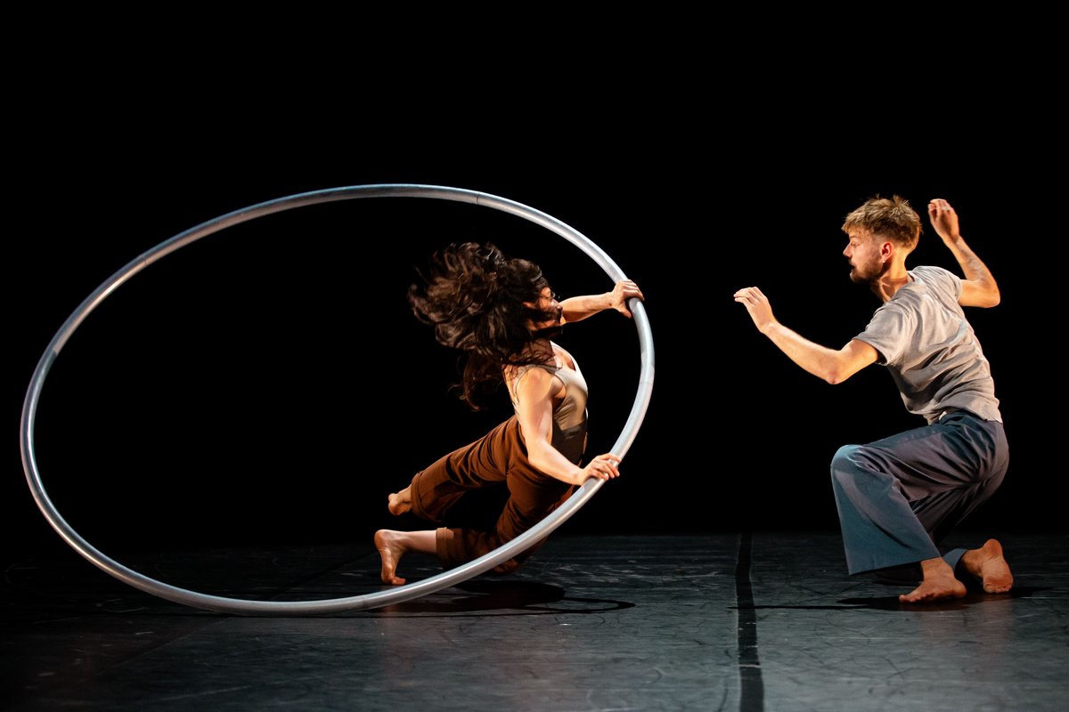 Peut-on être deux sans se fondre ? Peut-on coexister sans compromis, sans fusion, sans hiérarchie ? Tou·tes celles et ceux qui ont déjà tenté l’aventure à deux – et ça fait un paquet de monde – se reconnaîtront dans l’exploration de Jef Everaert & Marica Marinoni. Leur binôme semble ne pas pouvoir trouver de point de rencontre. Trop différents pour s’aligner, trop liés pour s’ignorer. Au centre de ce duo, une roue de fer. À travers elle, ils apprennent à communiquer, tombent ensemble, se relèvent pour recommencer. Un dialogue physique intense, qui se passe de mots et jette un regard neuf sur qui nous sommes… à deux !