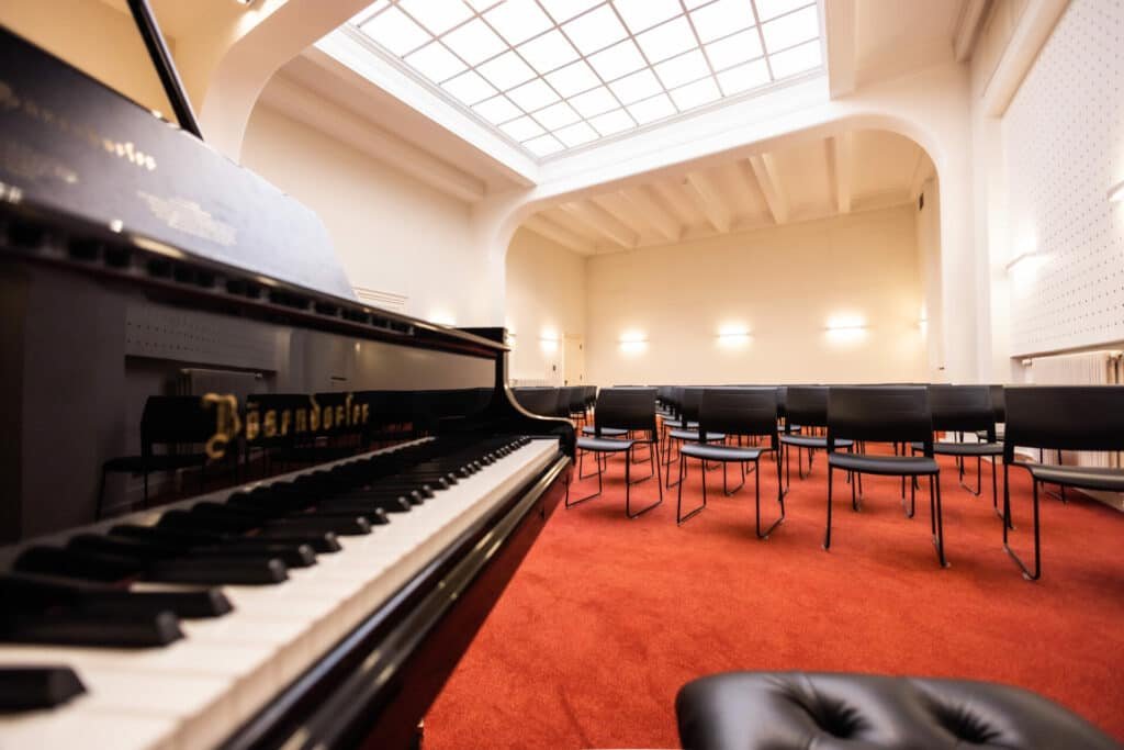 La salle de concert, baignée de lumière naturelle grâce à son plafond verrière et son tapis rouge vibrant, a été pensée en collaboration avec des musiciens pour une acoustique parfaite.