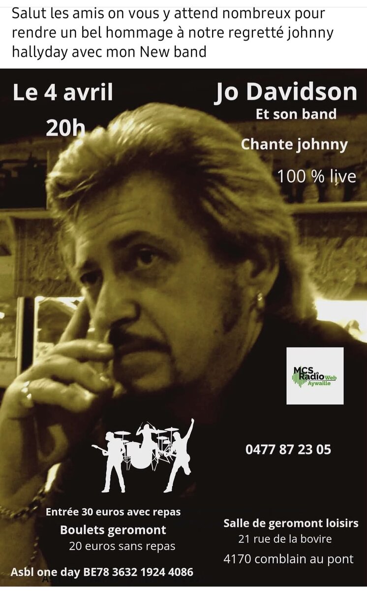 Vous aimez johnny Hallyday la star du rock and roll..réservez vos places vous ne serez pas déçu du spectacles...un show a ne pas manquer et du spectacle a ne pas rater. ..au plaisir de vous voir.. Et de venir applaudir jo davidson dans la bonne humeur. ..