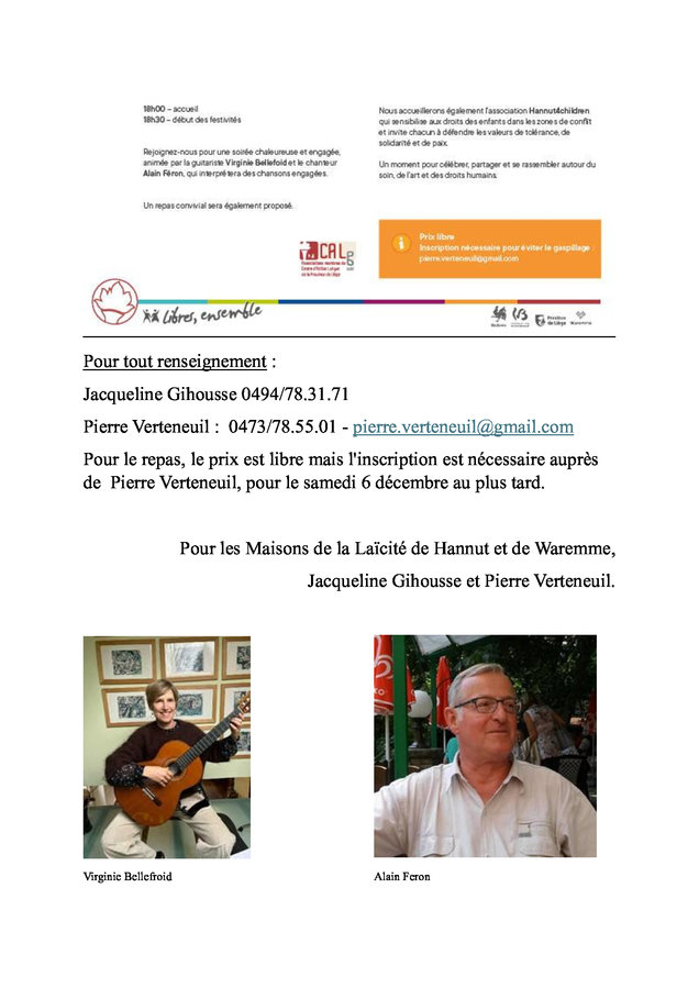 Accompagnez nous dans cette soirée qui se veut conviviale et amicale, animée par la guitariste Virginie Bellefroid et le chanteur engagé Alain Feron.