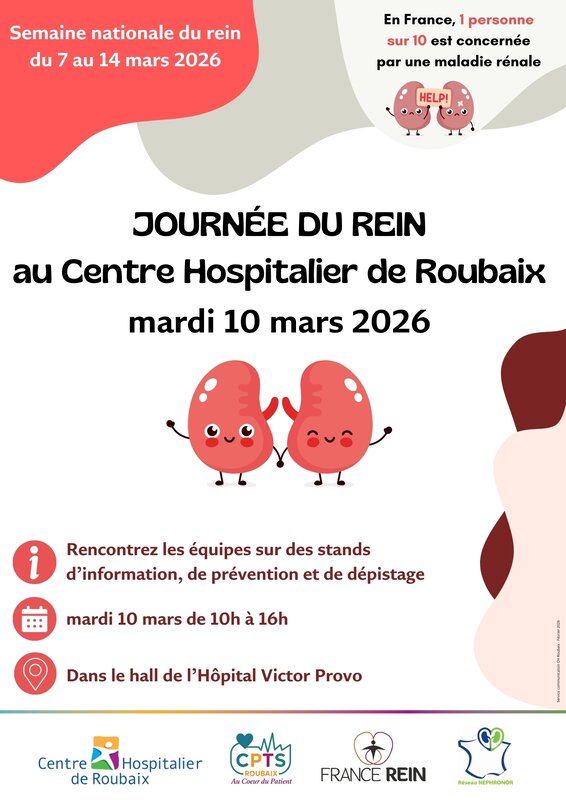 Le service de néphrologie du CH Roubaix, en collaboration avec la CPTS de Roubaix, France Rein et Nephronor, organise la Journée du Rein dans le cadre de la Semaine Nationale dédiée :