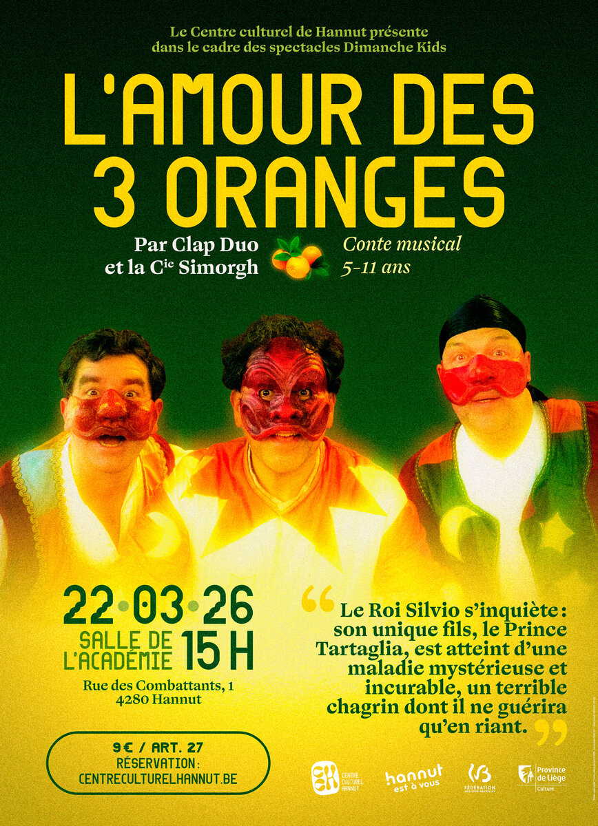 courage, empathie et confiance, ouverture à l’autre, sortilèges et péripéties en tous genres…Voici quelques-uns des ingrédients réunis pour faire de ce récit fantastique une formidable porte d’entrée sur l’imaginaire, et permettre aux jeunes (et moins jeunes) d’entrer en contact avec leurs émotions, leur intuition et leur perception d’eux-mêmes et des autres. Convaincus par la forme du conte musical, Clap Duo et la Cie du Simorgh nous livrent ici un merveilleux conte de fée traditionnel, énergique, drôle et plein de vitalité, dans une configuration originale directement inspirée de la Commedia dell’Arte. La mise en scène est d’Annette Brodkom, les masques d’Edith Barbieux et les costumes d’Astrid Lambeaux.