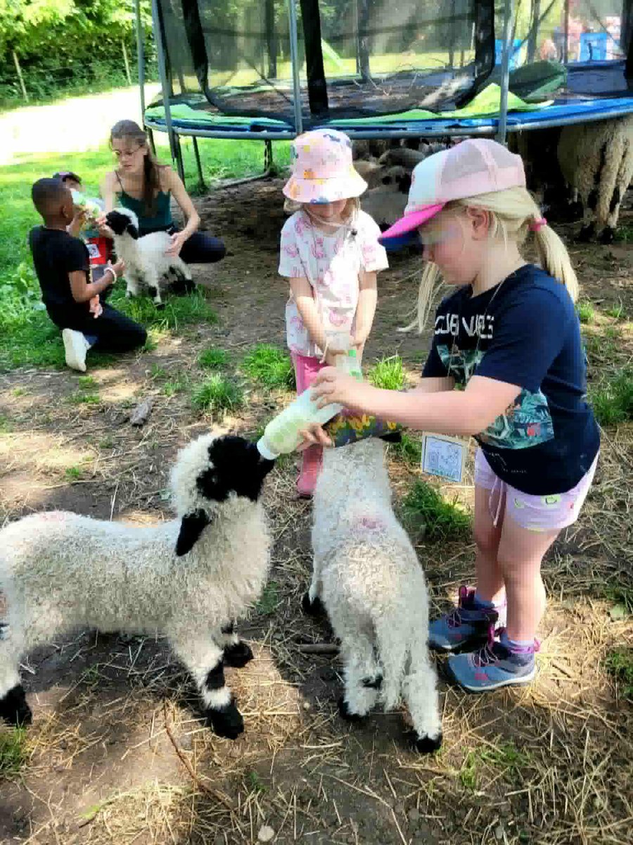 Auprès de nos moutons: toucher, sentir, découvrir, soigner, nourrir, observer, biberonner, écouter; mais aussi découvrir la transformation de la laine: trier, carder, laver, feutrer.