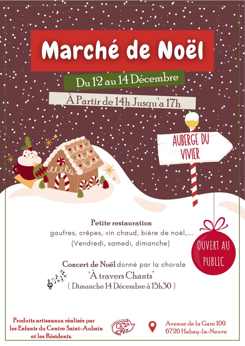 Venez découvrir notre Marché de Noël, des produits artisanaux sont proposés fait par nos résidents et enfants du Centre Saint-Aubain. Petite restauration, Crepes, Gaufres.. Boissons Vin chaud et beaucoup d'autres.