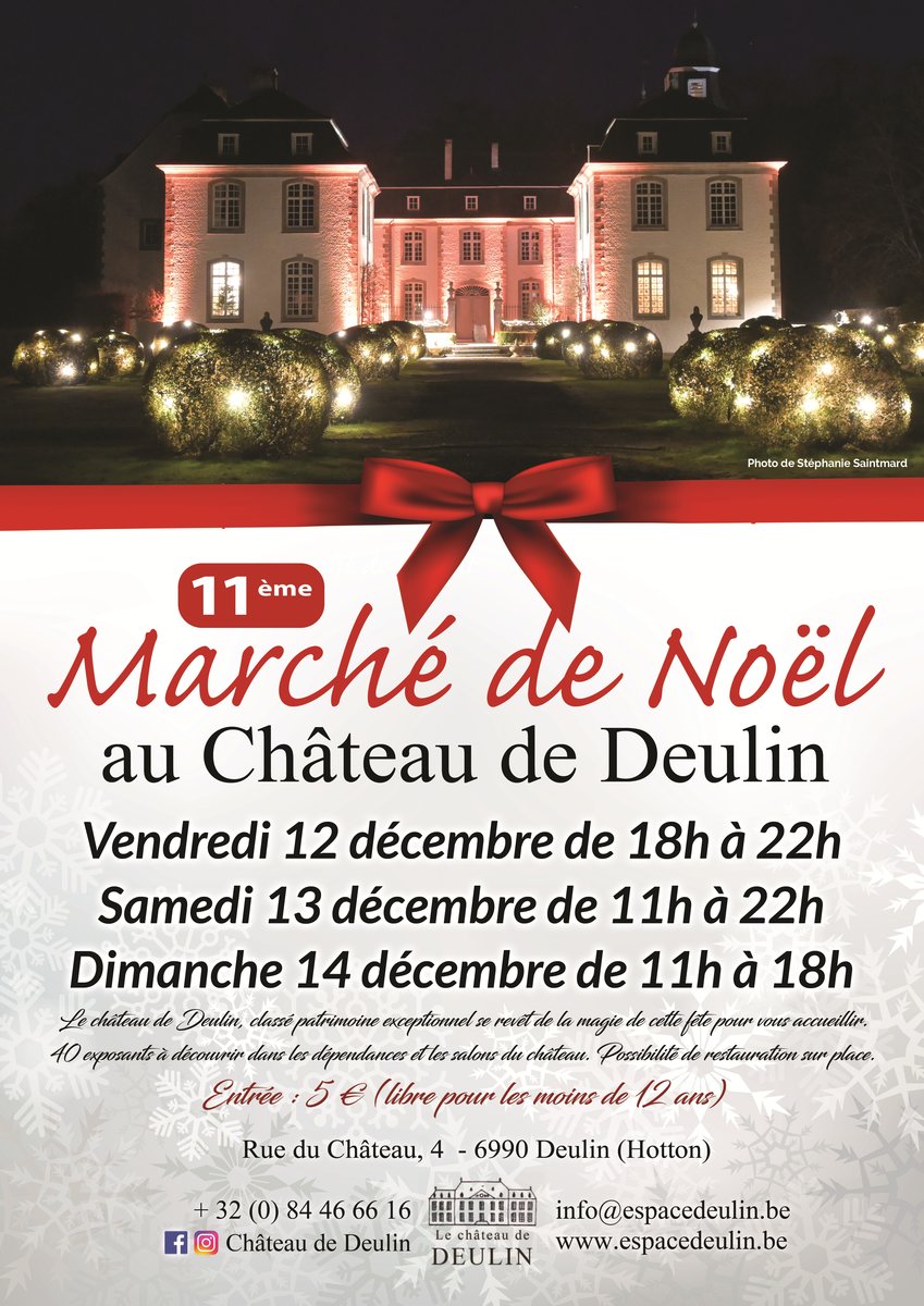 Le 11ème marché de Noël du Château de Deulin aura lieu dans les dépendances du Château. Produits de bouche, sculptures, bijoux, fantaisie, créations en bois, céramique, vêtements, chapeaux, accessoires, produits de bien-être, antiquités, décorations,...