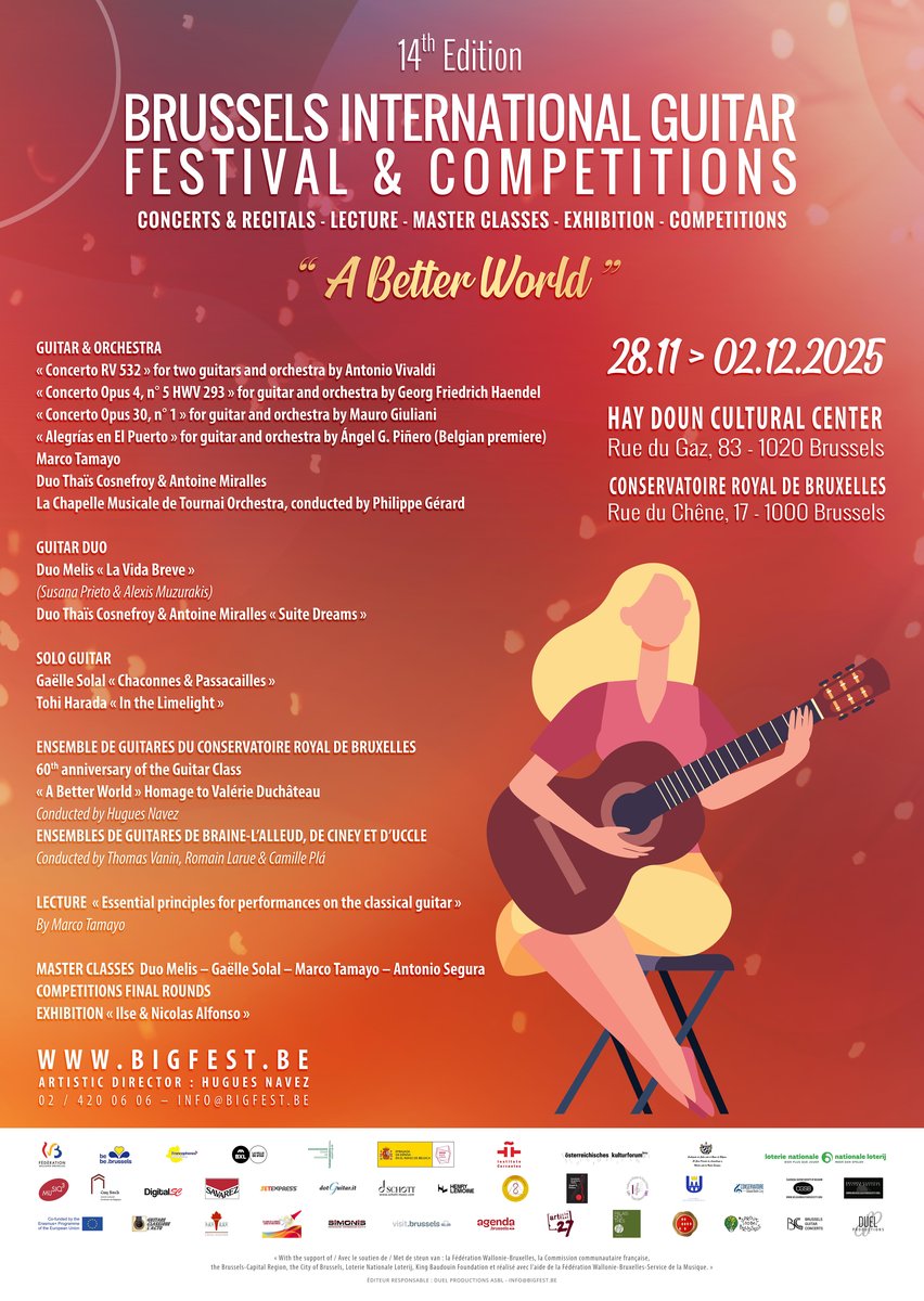 Dédiée à « Un Monde meilleur », voici la 14e édition du Brussels International Guitar Festival & Competitions, l’événement incontournable et très attendu dans la capitale de l'Europe par les mélomanes et les aficionados de la guitare.