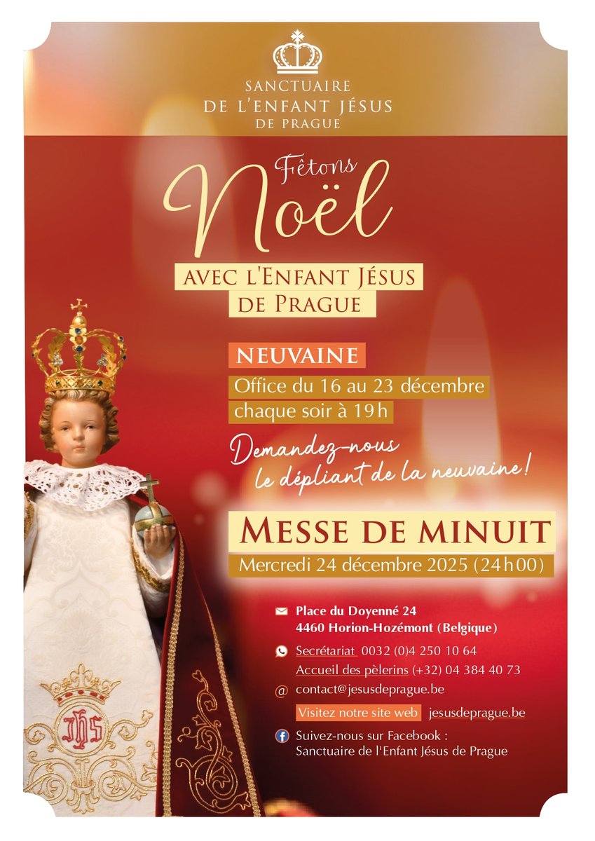 Comme chaque année, nous vous invitons à participer à la Neuvaine en l’honneur de l’enfant Jésus de Prague, en préparation à la fête de Noël. Chaque jour, du 16 au 24 décembre, récitez les prières de la Neuvaine en union avec tous les pèlerins du Sanctuaire de Horion-Hozémont. Rendez-vous ce dimanche 21 décembre à 15h pour le pèlerinage de décembre et le 24 décembre pour la Messe de Minuit !