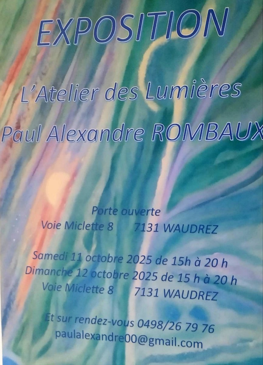C'est un jour comme les autres que Paul Alexandre Rombaux prend le pinceau en main et se laisse guider par sa voix intérieure. Être spirituel et adepte de Gustave Jung, il continuera son travail au fil des années. Possédant sa propre galerie L' Atelier des Lumières, il expose à Waudrez, Voie Miclette 8 pour notre plus grand plaisir. Sa couleur ? Le bleu parce qu'à travers cette couleur les traits de ses personnages, les formes et des animaux même parfois se dessinent le mieux mais aussi d'autres couleurs viendront s'ajouter à sa palette. Paul Alexandre Rombaux se veut avant tout un peintre de lumière. À découvrir absolument !