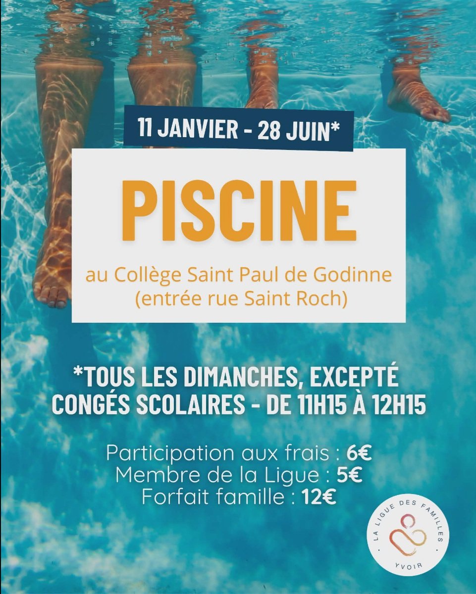 La Ligue des familles d'Yvoir ouvre la piscine du Collège de Godinne pour une heure de nage libre tous les dimanches (sauf congés scolaires).