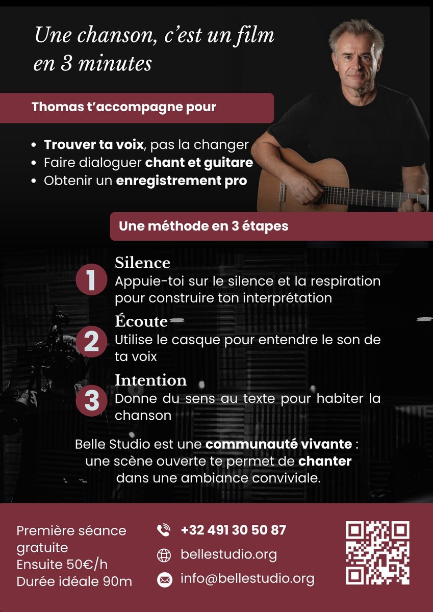 Tu as envie de chanter, d'être accompagné.e à la guitare, de t'enregistrer dans un studio professionnel? Viens découvrir Belle Studio lors des journées Portes Ouvertes. Tu y découvriras les enregistrements des autres membres de la communauté, la méthode Belle Studio pour libérer ta voix et ton interprétation, une ambiance de collaboration bienveillante où on n'essaie pas de transformer ta voix, mais plutôt de la découvrir, d'en explorer les possibilités. Une chanson c'est un film en 3 minutes. Exploite le potentiel théâtral de tes chansons. Français, Anglais ou Espagnol.