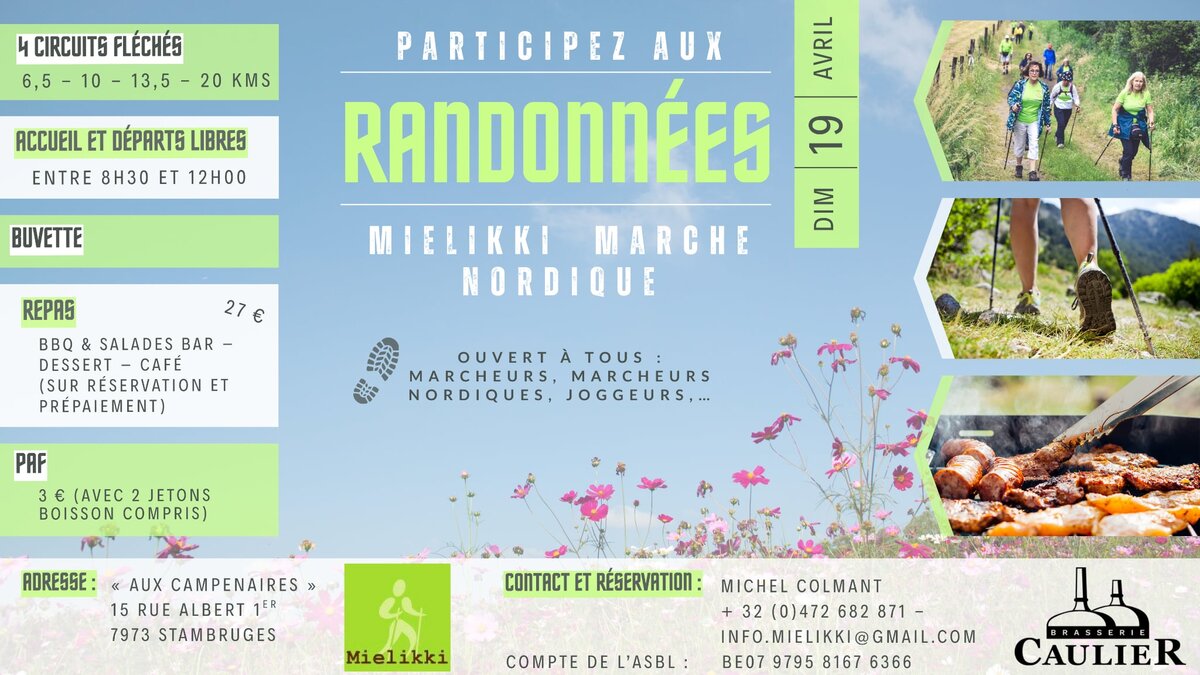 Sur réservation et pré-paiement, possibilité de repas entre 12h30 et 14h : bbq & salades bar - tarte - café (27 € à payer sur le compte de l'asbl Mielikki : Be07 9795 8167 6366)