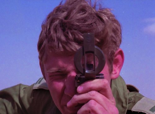 Absurdité d’une guerre en couleurs clinquantes : un film de promotion de l’armée israélienne des années 1960, subtilement détourné par Aljafari, où les images viriles et triomphalistes occultent toute présence de victimes.